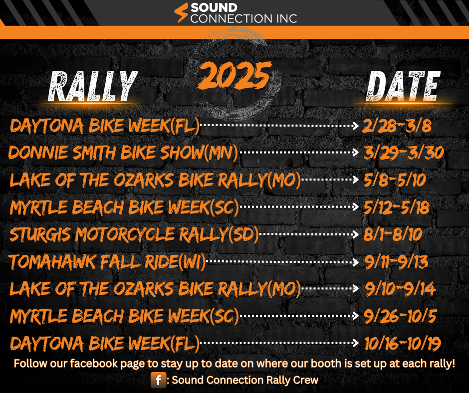 Catch our Rally Crew on the road at one of these locations! We install audio and lighting in Harley's and carry Rockford Fosgate, 20Twenty Lighting, Kenwood & Hertz. At Sturgis we are the preferred installation team of Rockford Fosgate and work alongside them at our shared booth on Lazelle St.