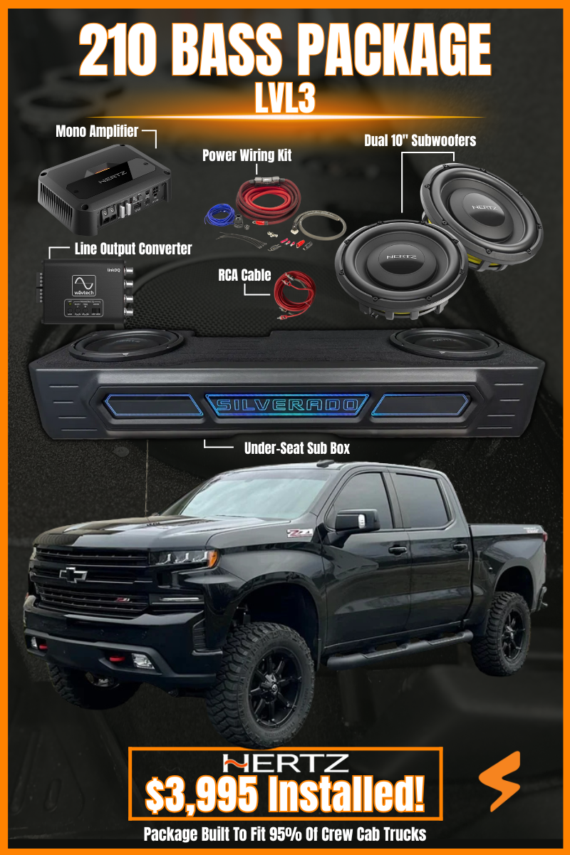 If you want your truck to sound as good as it drives, the 210 Bass Package – LVL 3 delivers unmatched clarity, depth, and build quality. Featuring high-performance Hertz MPS 250 10” subwoofers and the powerful Hertz Compact Power 1.700 amplifier, this setup is all about controlled, refined bass—without compromise.
