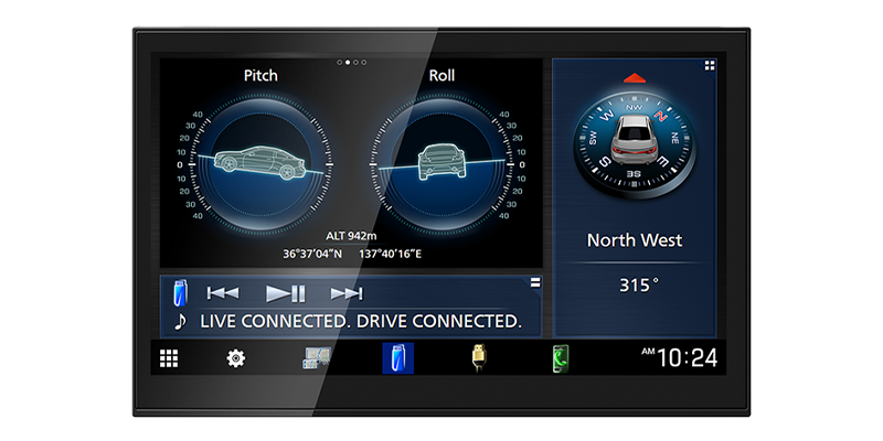 The 8" home screen is composed of a Driving Widget as well as a Source Control Widget overlaid on the background. You can move the Driving Widget from side to side or enlarge the Source Control Widget to optimize the screen for your intuitive operation. The Driving Widget allows selection of a clock, compass, or equalizer setting, etc., while the background allows selection of album art, audio visualizer, or photo.