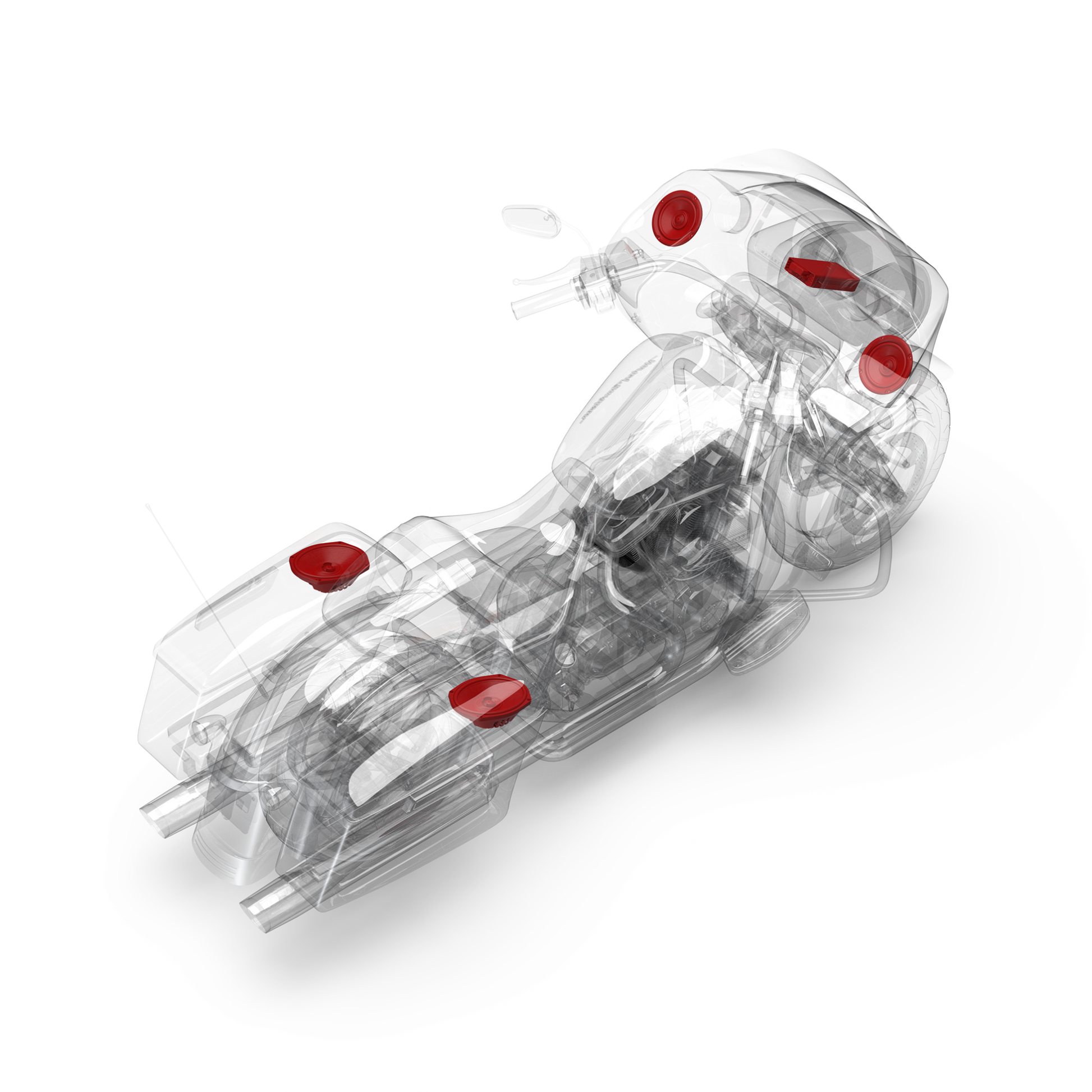 - Speakers custom tuned to hear music over wind, road & exhaust noise at highway speed